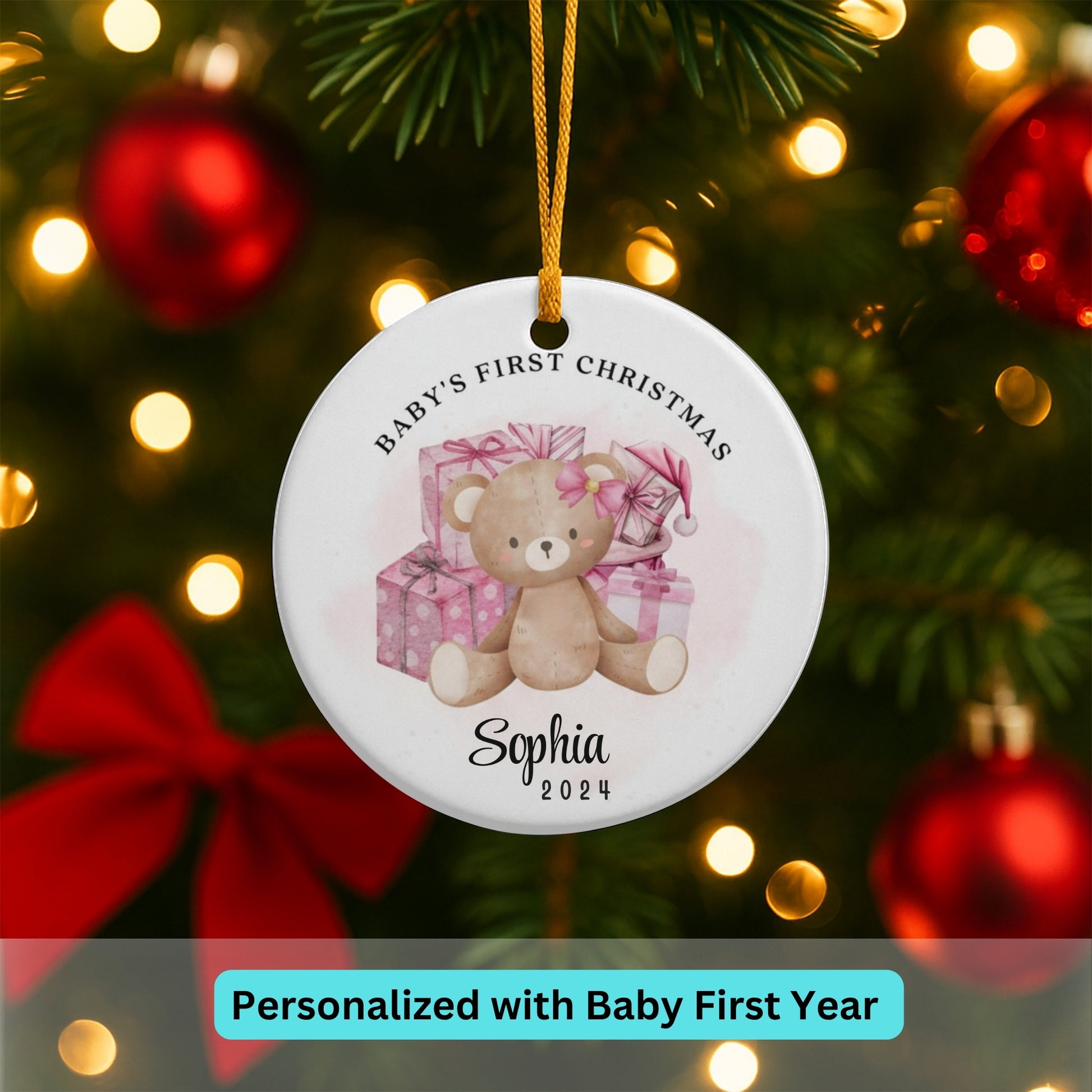 Baby's First Christmas Teddy Bear Bauble | Personalised Xmas New Arrival Ceramic Hanging Tree Decoration | Name, Custom Colours