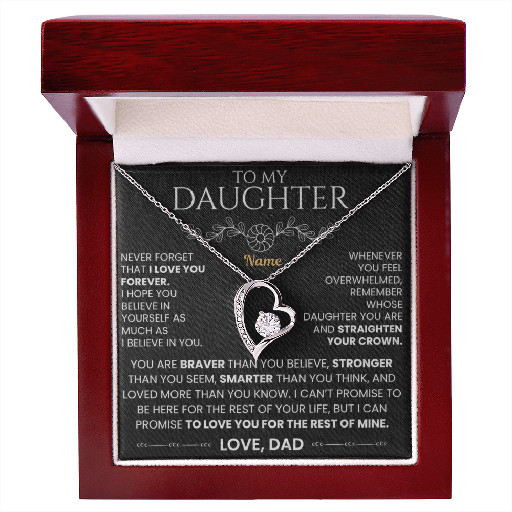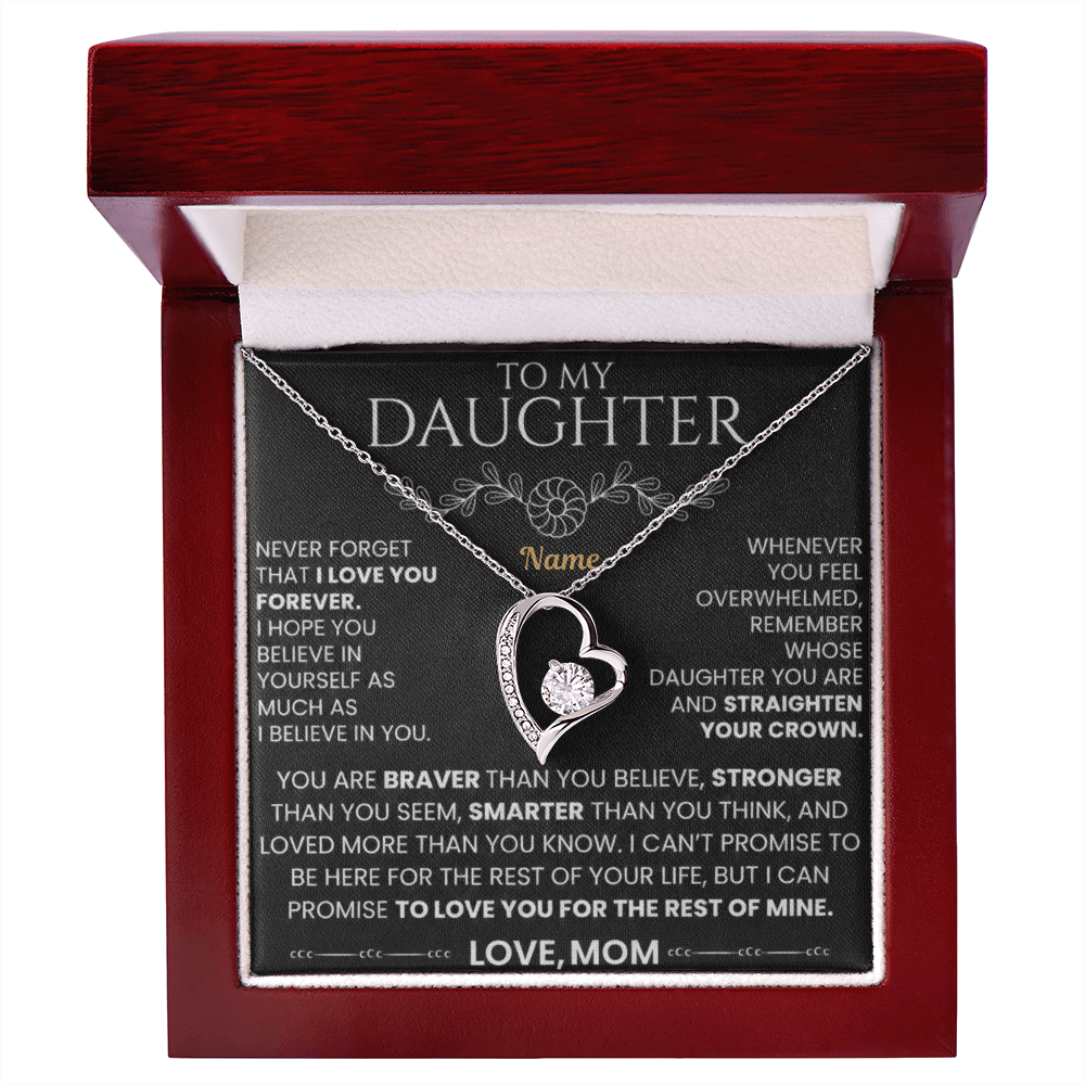 Never forget that I love you forever. I hope you believe in yourself as much as I believe in you. Whenever you feel overwhelmed, remember whose daughter you are and straighten your crown. You are braver than you believe, stronger than you seem, smarter than you think, and loved more than you know. I can’t promise to be here for the rest of your life, but I can promise to love you for the rest of mine.