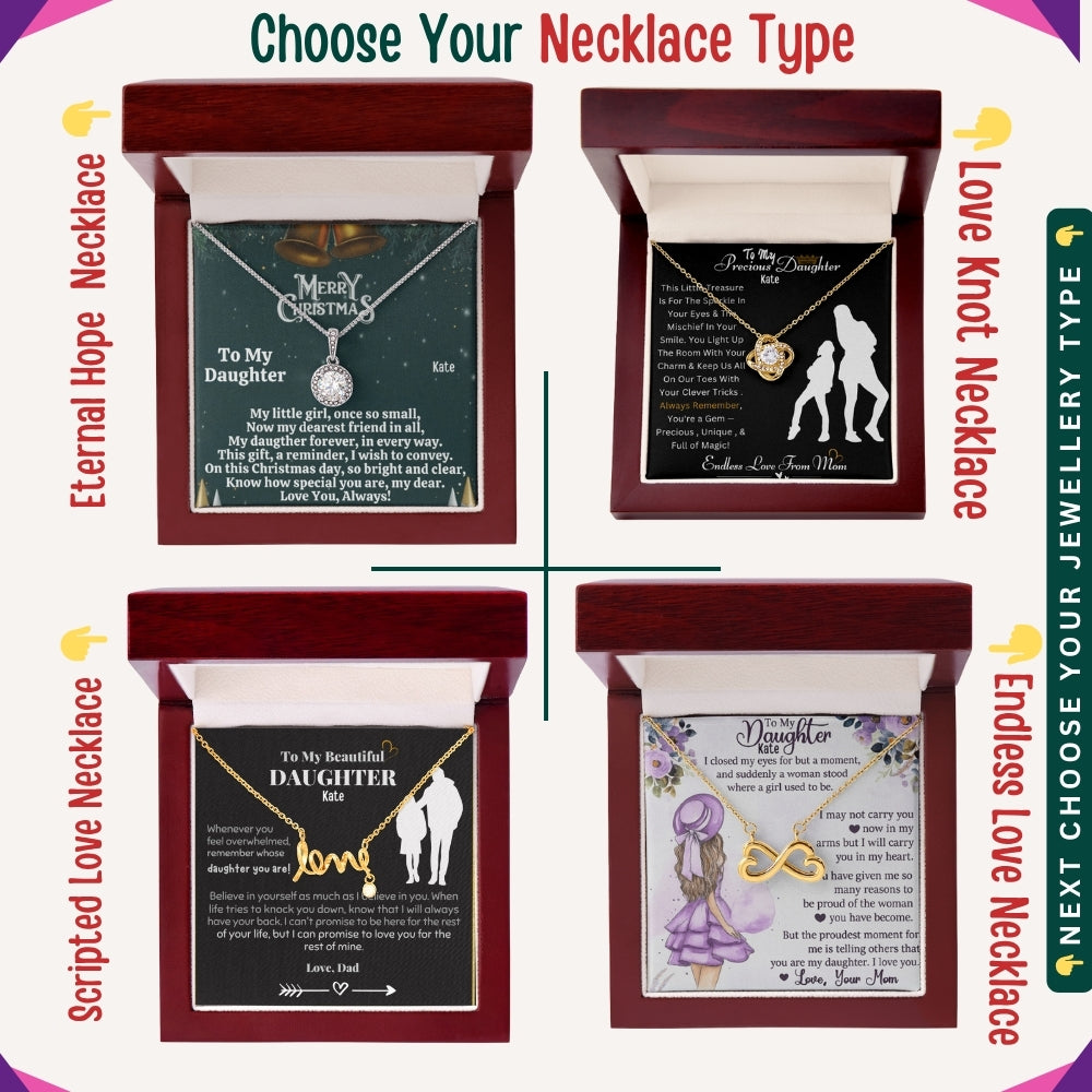 Select your favorite Message Card, choose a Necklace Design, and pick your Necklace Shine & Jewelry Box.