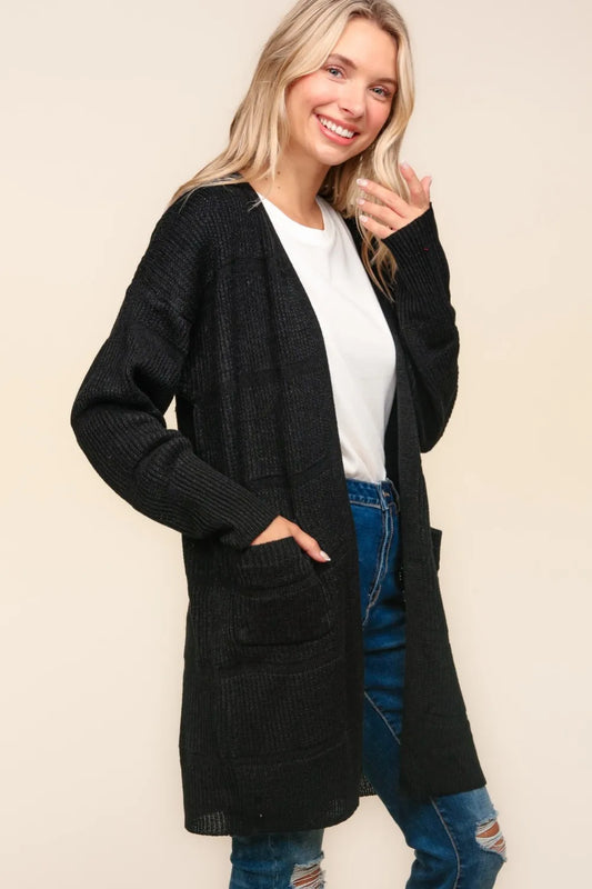 Open Front Checkered Drop Shoulder Cardigan